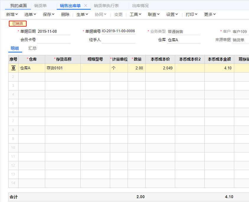 如下图所示,第三张销货单对应的出库单单据日期是2019-11-10,而查询销货单执行表按出库日期2019-11-08进行查询时,第三张销货单是需要显示的,只是对应的出库单号,累计出库数量不显示,而是显示在未出库数量上。