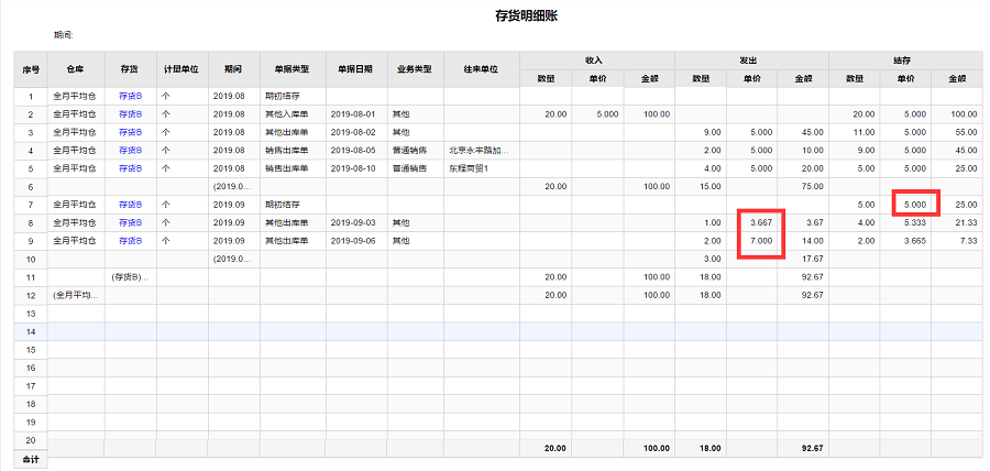 而上面李会计说的奇怪的问题,就是因为9月初的第二笔其它出库单,是手工确认成本的,成本单价是7元,而成本金额是14元。此时用全月平均法的公式,我们可以算出成本金额=(25+0-14)/(5+0-2)=3.667。