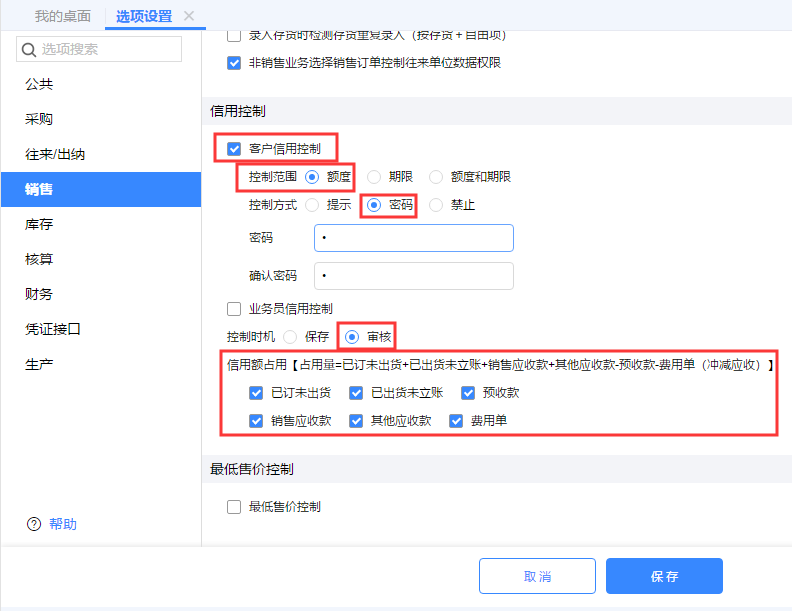 (2)系统管理-选项设置-销售-启用客户信用控制,另外控制时机为“审核”;