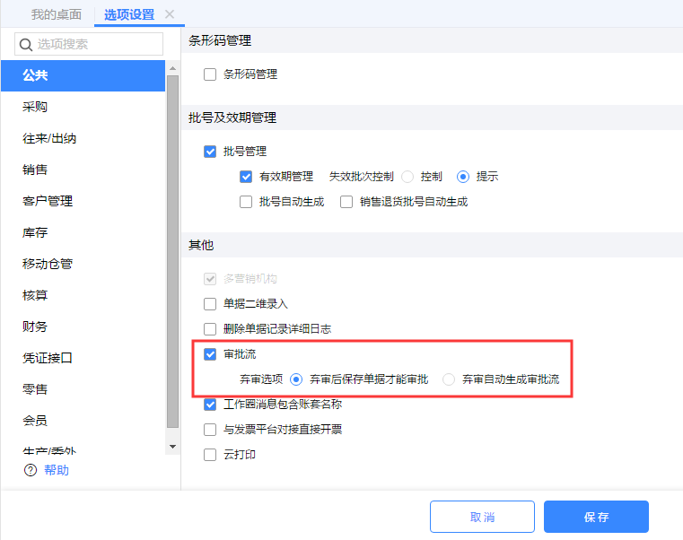 (3)系统管理-选项设置-启用“审批流”;