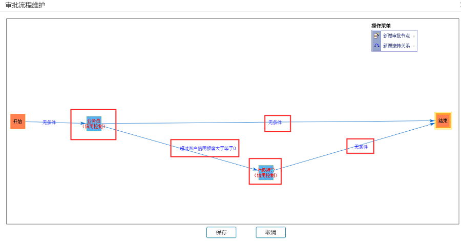 (5)在新增业务员到上级领导的流转条件时,使用“超过客户信用额度”来作为流转条件;