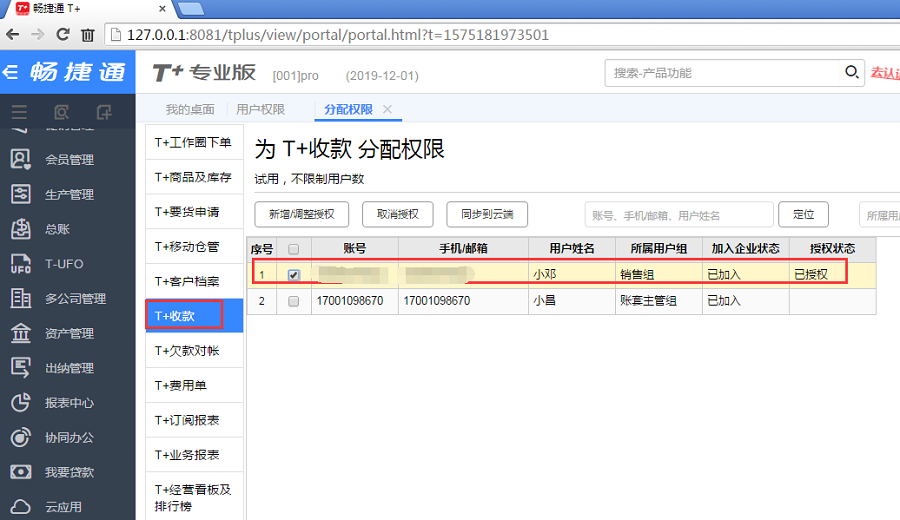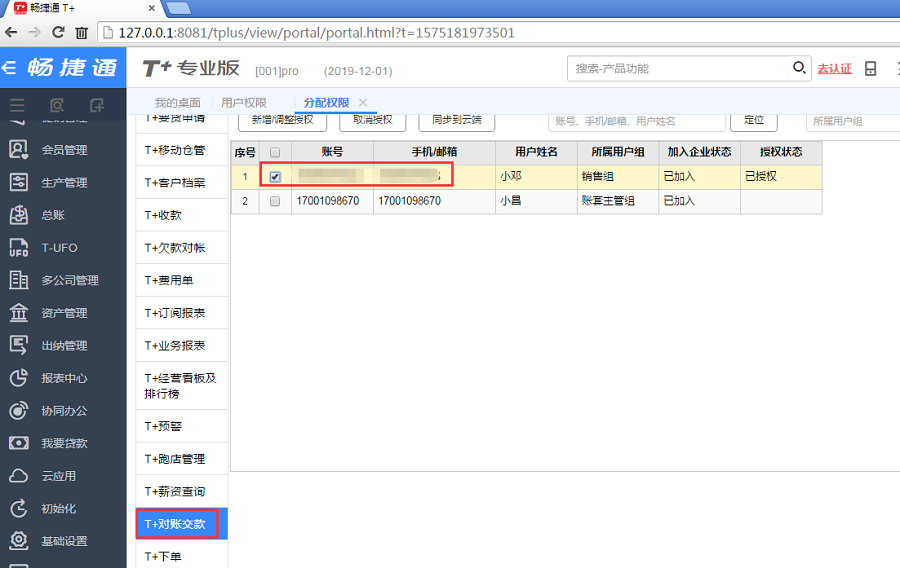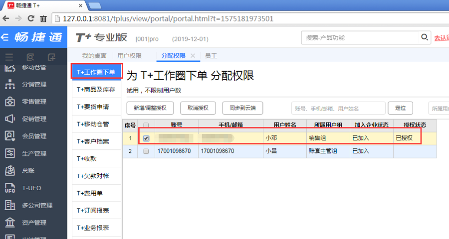 (1)系统管理-用户权限-移动应用授权,给予业务员授予“工作圈下单”、 “T+对账交款”、“T+收款”的权限;