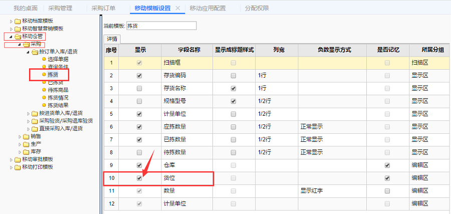 STEP2.移动仓管-采购-按订单入库/退货-拣货-货位-勾选【显示】-保持,如下图所示: