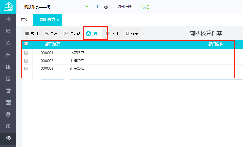 ①编辑部门辅助核算档案。依次点击【设置】-【辅助核算】-【部门】-填写连锁店名称编辑辅助核算档案。