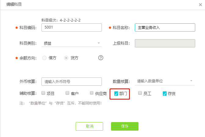 ②各门店相关收支科目挂上部门辅助核算项。如:主营业务收入、应收账款等。依次点击【设置】-【科目期初】-选择相应会计科目-【编辑】-勾选【部门】辅助核算。