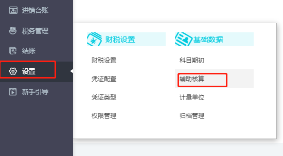 1、编辑客户辅助核算档案。依次点击【设置】-【辅助核算】-选择【客户】辅助核算,编辑客户档案。