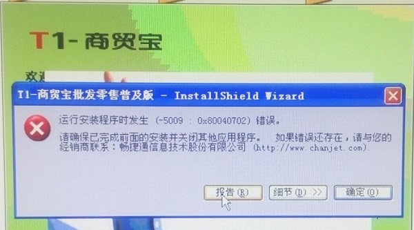 安装T1商贸宝时出现以下错误提示:运行安装程序时发生(-5009:0x80040702)错误?