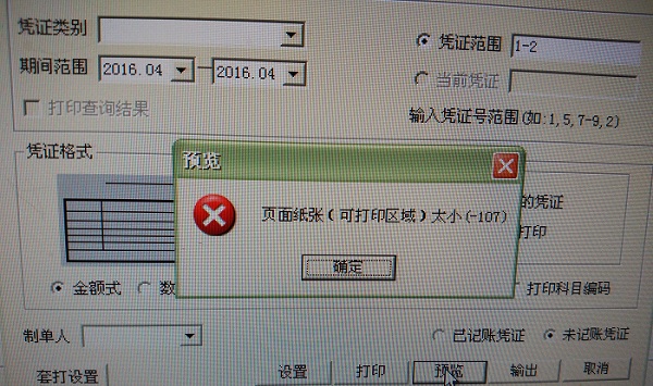 T1软件打印凭证的时候提示:页面纸张(可打印区域)太小(-107)?