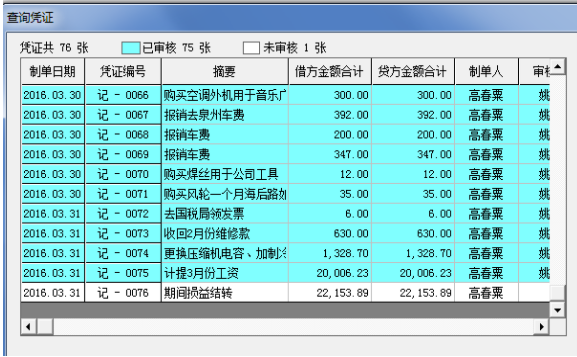 T3审核界面,蓝色表示已审核,白色表示未审核的凭证。