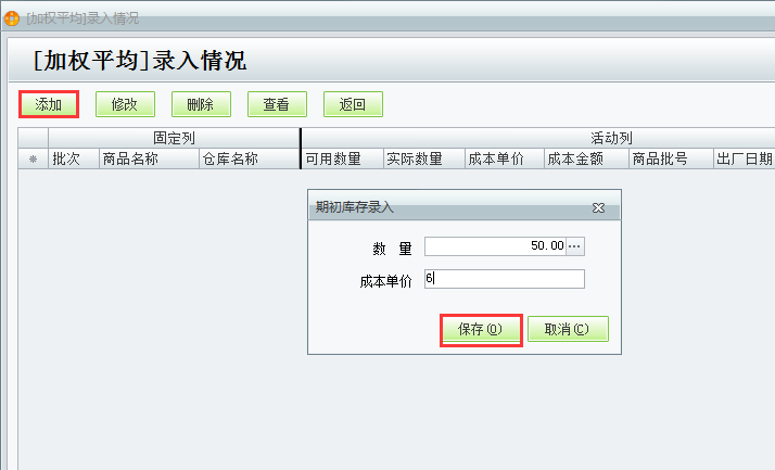 3、点击添加录入数量,成本单价,点击保存即可。