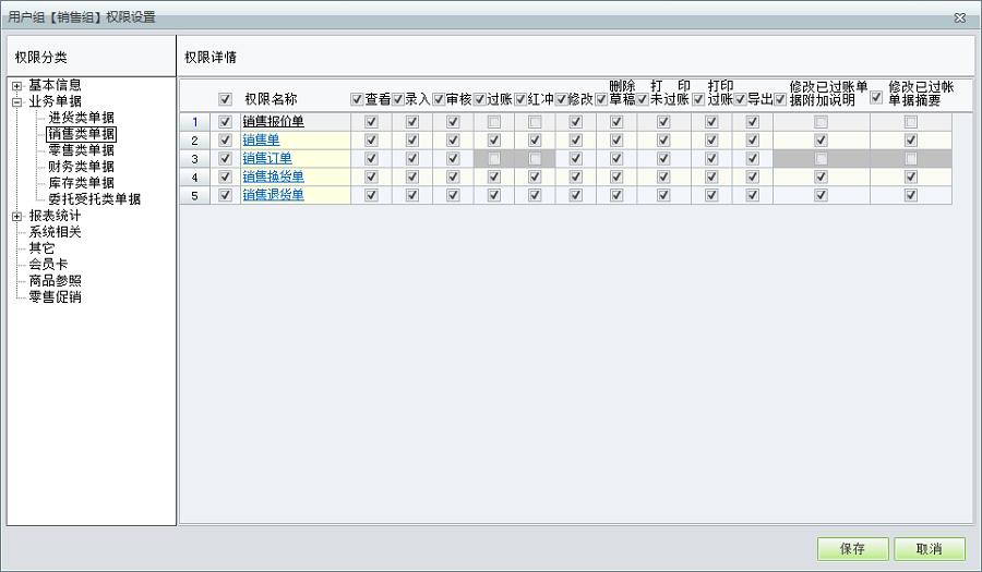 3、在权限分类中找到所需权限位置,在权限详情上将需要的权限勾上,不需要的权限取消勾,完成之后点击保存即可。