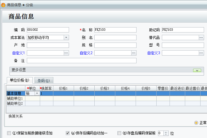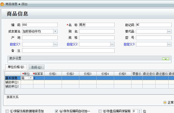 2、点击上面的同级添加,输入商品的详细资料,点击保存。