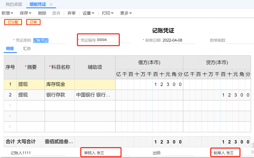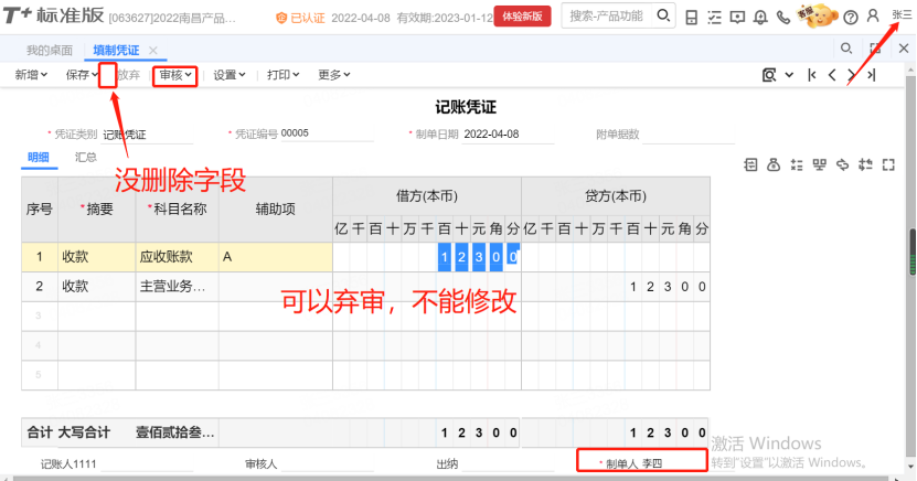 3. 分别登入张三、李四两个用户填制凭证,会计张三新增凭证00004,之后用会计李四登入新增凭证00005,之后张三再登入可以查看和弃审李四制作的凭证,不能修改,表头也没有删除字段。