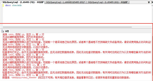 2、在账套库dbcc checkdb查询有误,提示无法创建数据库快照。