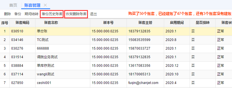 T+C企业管理员的“账套管理”中新增了两项功能“备份历史账套”、“恢复删除账套”