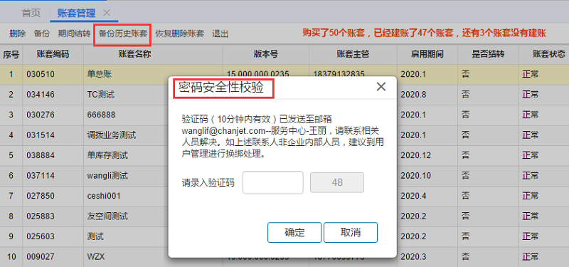 选中需要备份的账套,点击“备份历史账套“,会弹出输入验证码的界面,