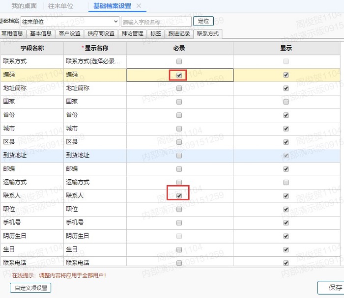 因为联系方式可以录入多行,可以录入多个联系人,所以需要将编码和联系人都设置必录才可以的。