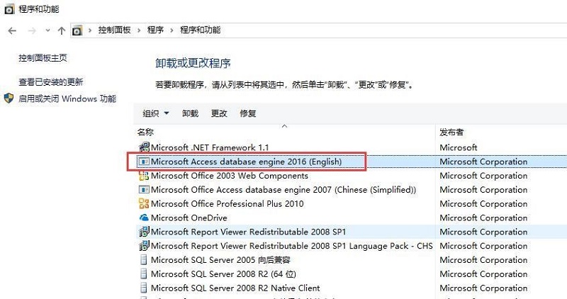 2)从控制面板中卸载所有的 Microsoft Access database engine XXXX(其中 XXXX 代表版本,可能是 2010,2016);