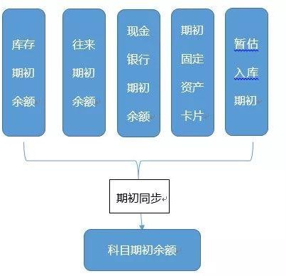 库存期初、往来期初、现金银行期初、期初资产卡片以及暂估入库期初经过“期初同步”后, 对应的数据会转入科目期初余额里。