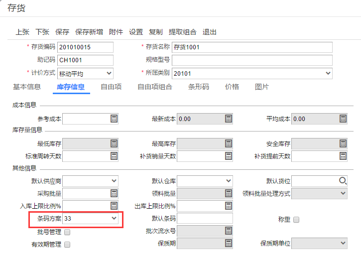 2、 在存货库存页签中,选择上面设的条码方案,并保存,