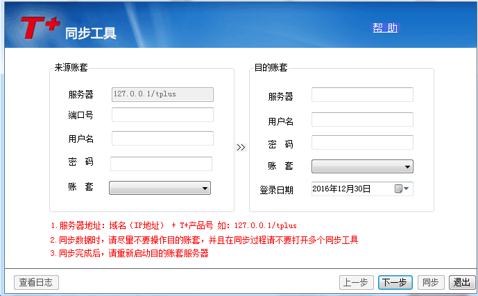 2、右侧输入目标账套服务器地址、用户名、密码后,选择账套。