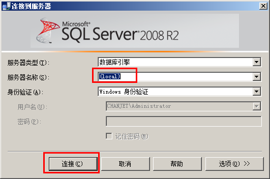 3、我们需要进数据库查看 008 账套对应的物理文件名称,点击“开始”-“所有程序”-“Microsoft SQL Server 2008 R2”-“SQL Server Management Studio”- 服务器名称选择“(local)”,身份验证选择“windows 身份验证”,点击“连接”按钮,进入 SQL2008R2 数据库企业管理器,如下图所示:
