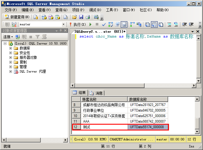 如下图所示,查到 008 账套的数据库名称为:UFTData55174_000008