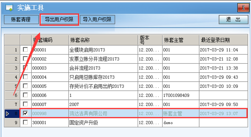 3、点开实施工具,选择账套之后,点击“导出用户权限”: