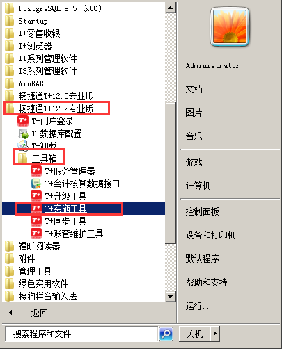 2、装好 12.2 电脑上,依次点击“开始”-“程序”-“畅捷通 T+12.2 专业版”-“工具箱”, 找到“实施工具”: