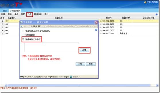 (1) 直接升级,当账套信息为红色字体时,表示该账套为低版本,可以选中,点击升级,选择直接升级。