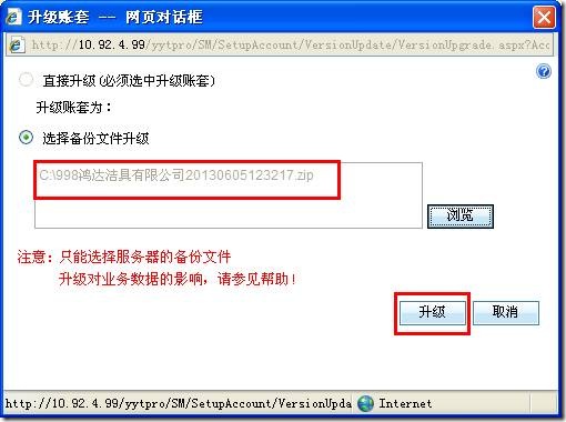 (2) 选择备份文件升级,点击“浏览”选择到服务器上的备份文件,点击“升级”。