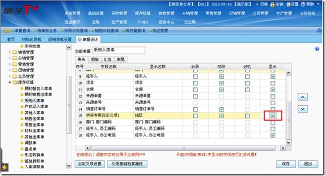 4、单据设计中,勾选“地区”字段的“显示”然后“保存”。