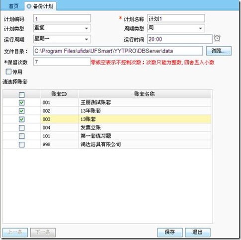 通过设置备份计划,可以实现对账套的批量备份、自动备份。一个备份计划中不仅支持一个账套的备份,也支持多个账套的备份,如果是多个账套的备份计划,按照账套编号顺序执行备份。