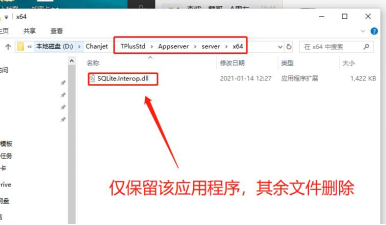如上述方案操作后还是不行,请继续前往Chanjet\Appserver\server\x64,仅保留该路径下的SQLite.Interop.dll,其余文件全部删除后,重新尝试解绑激活。
