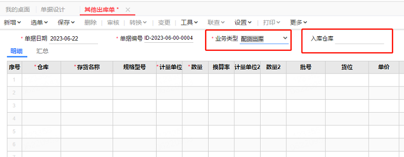 4、修改表头业务类型,将【其他】改成【配货出库】后,【入库仓库】字段就会显示出来了。