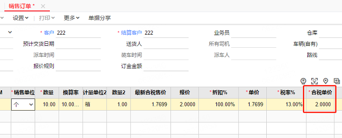 2、将销售单位切换为个后,单价没有变成1,而是变成了2,