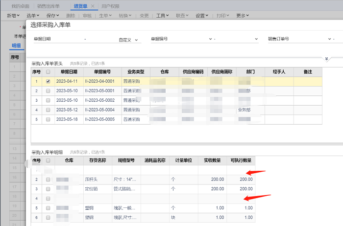 进货单选单,选择采购入库单,勾选表头,明细数据没有勾选上