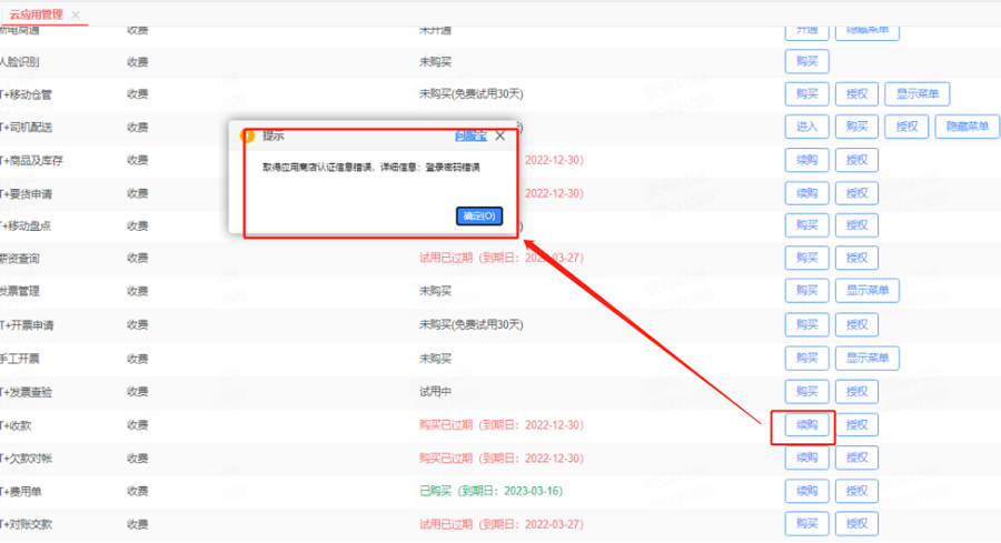 在云应用管理选择移动应用点击续费时提示取得应用商店认证信息错误,详细信息: 登录密码错误。