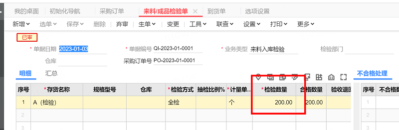 2、采购订单生成到货单后,再生成检验单,检验单数量可以超到货单数量。