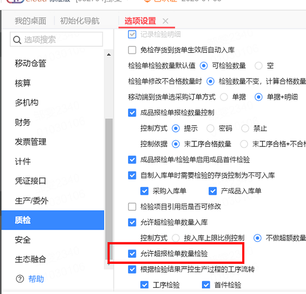 1、【系统管理】-【选项设置】-【质检】页签勾选启用“允许超报检单数量检验”。