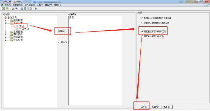 5、再点击数据导入导出,把凭证从可选项目中添加到已选项目,选择用友通数据导出EXCEL文件后点击执行。