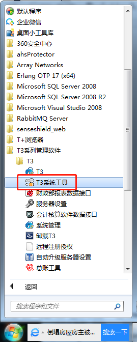 1、点击桌面左下角的开始-所有程序,找到T3企业管理软件文件夹展开,找到T3系统工具