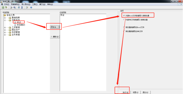 9、把凭证从可选项目中添加到已选项目,选择外部EXCEL文件导入到用友通后点击执行。