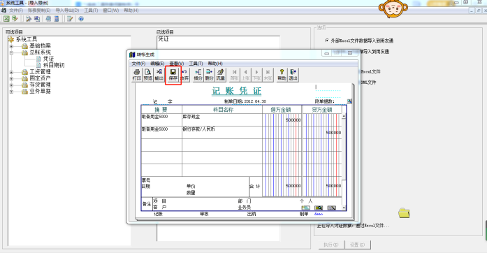 10、导入过程会依次弹出凭证,需要手工依次点击保存。导入完毕后会弹出导入报告。