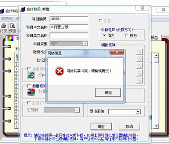 T3增加科目的时候,会提示网络共享冲突,一般是增加字母和数字的不报错,但是一旦加中文字符的科目就报错
