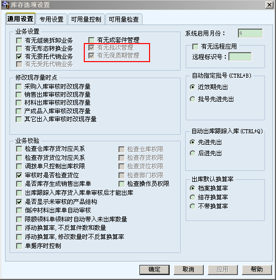 1、在库存选项设置中将“有无批次管理”、“有无保质期管理”、“失效存货预警”勾选上。