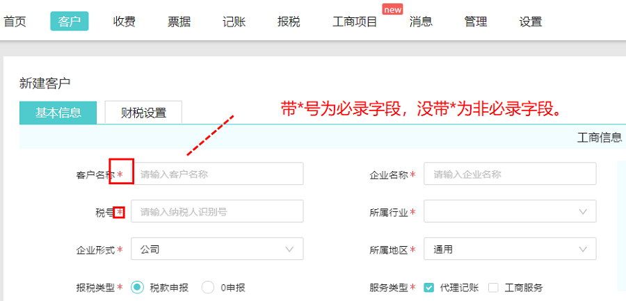 1.客户信息中带*号字段为必录字段,没有带*号为非必录字段,但是税务资料信息不填写会影响一键报税功能;