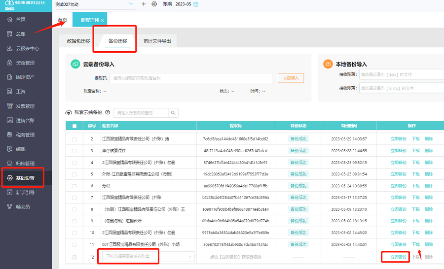 点击【账套迁移】-【备份迁移】-【本地备份导入】选择,备份下载好的文件,点击【立即导入】,导入后系统会新自动新增账套。