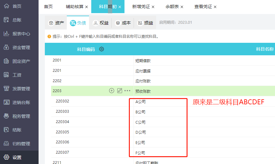 1.预收账款设置ABCDEF明细科目现要变为辅助核算,可以在预收帐款再设置一个二级科目科目并启用辅助核算。