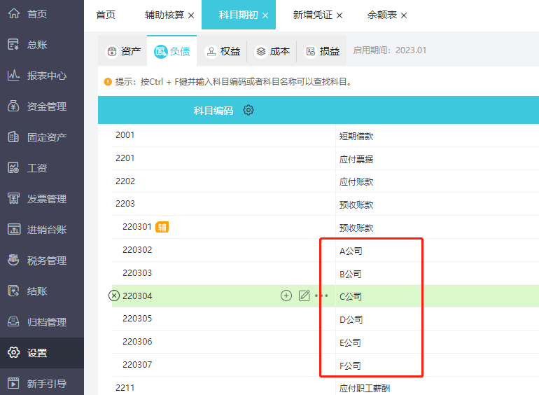 2、就可以在预收账款一级科目下新增二级明细科目ABCDEF。